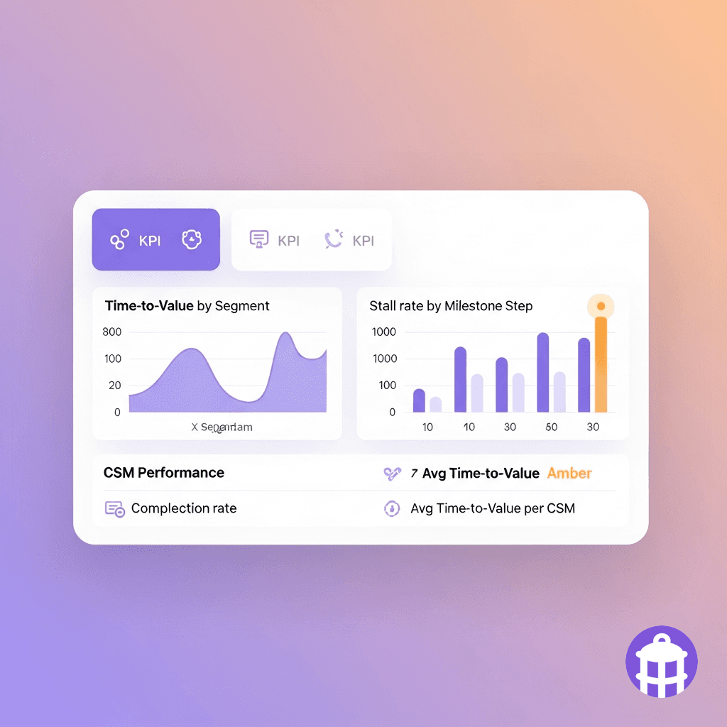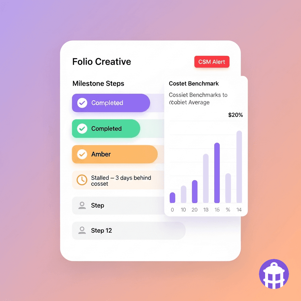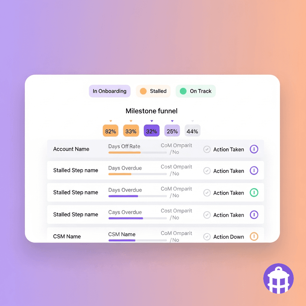 Every onboarding step is tracked from product events. Automated actions fire on schedule; CSMs are alerted when intervention is needed.