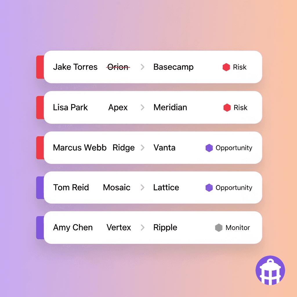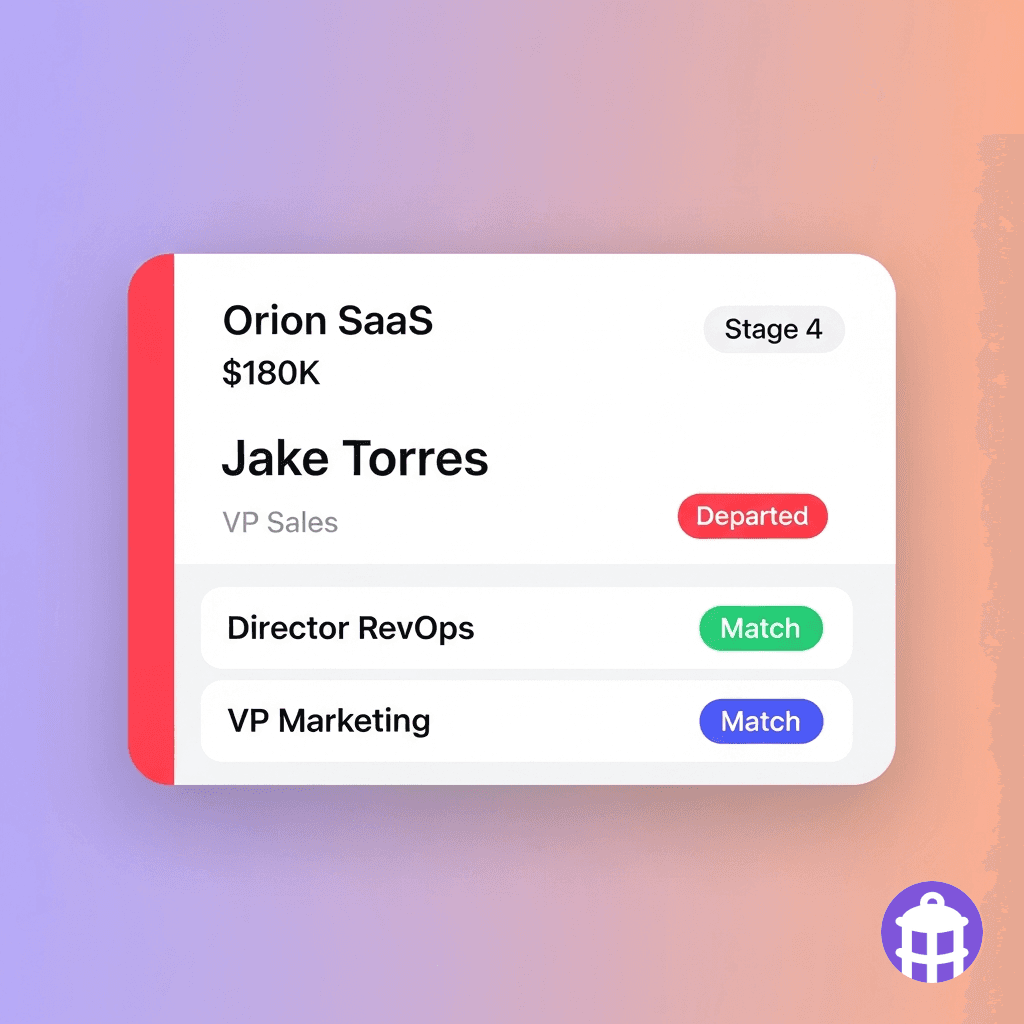 Deal risk flagged the day the contact departs. Replacement research begins automatically.