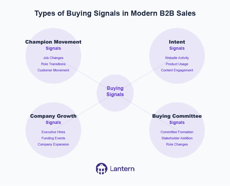 Successful signal-based selling relies on detecting and acting upon various types of buying signals. Here's a comprehensive breakdown of the key signals modern sales teams should monitor:
